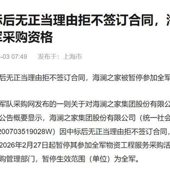 【不止海澜之家!四家服饰企业中标军采却拒签,全军采购资格被暂停】很多投资者都非常关心海澜之家因中标后,无正当理由拒不签订合同,被暂停全军采购资格的事情。