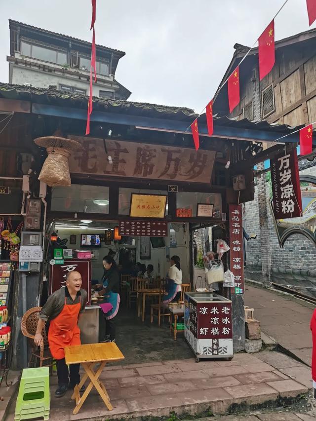 就找最窄、最坑坑洼洼的那条路走准没错!这里每一条青石板路都被磨得锃亮,如果你下雨天去,可能还会有点滑脚呢!老街两边全是老铺子,老街上好吃的太多啦,叶儿粑、烤玉米、花椒鸭……太香啦,在街道上,我还撞见了老爷爷在编竹篓,好漂亮,手真巧呀!