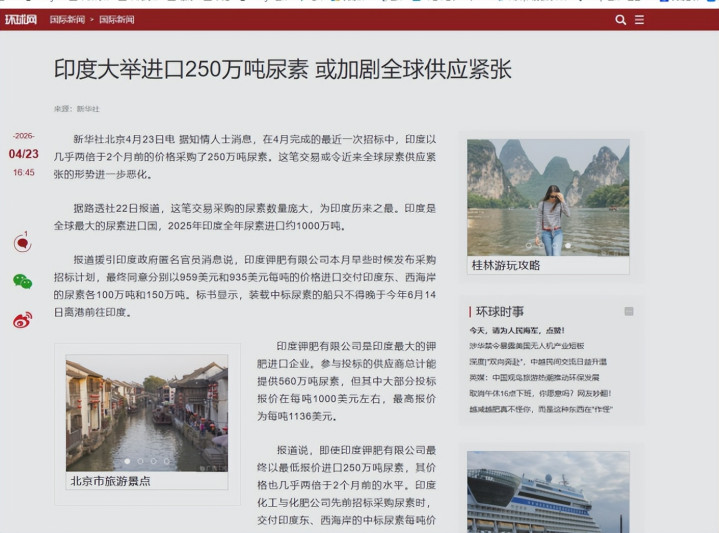 更关键的是,印度此次一次性抢购250万吨尿素,还是历史最高纪录,相当于在本就紧张的全球市场里“抢货”,这一下就加剧了供需失衡。本来供应就少,印度还这么大规模抢,其他依赖尿素进口的国家肯定会跟风囤货,到最后,全球化肥供应只会更紧张,价格也会继续涨,这就是地缘冲突对大宗商品市场的直接反噬,印度不过是被波及的其中一个罢了。